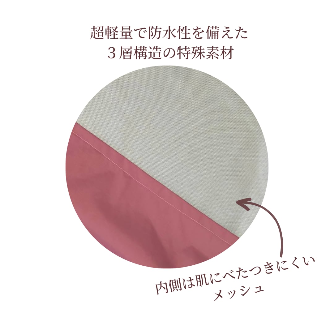 超軽量で防水性を備えた3層構造の特殊素材を使用し、内側は肌にベタつきにくいメッシュ素材を採用しています。